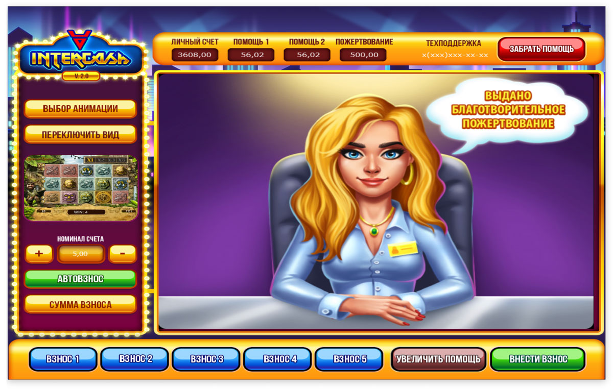 Программное обеспечение InterCash является сертифицированным АПК для приёма и выплаты благотворительных пожертвований у игроков в Ваших залах и терминалах. Суть работы юридически заключается в том, что все деньги идут на счёт Фонда Взаимопомощи "Знание". Любая ставка оформляется через кассира или купюрник. Фонд "Знание" реализуя свою благотворительную программу вправе выплатить пожертвование участнику через кассу или диспенсер. Все отношения между БФ "Знание" и вашей фирмой (или нашей по доверенности) регламентируются договорами. Все адреса фиксируются в Реестре адресов и их можно легко проверить.