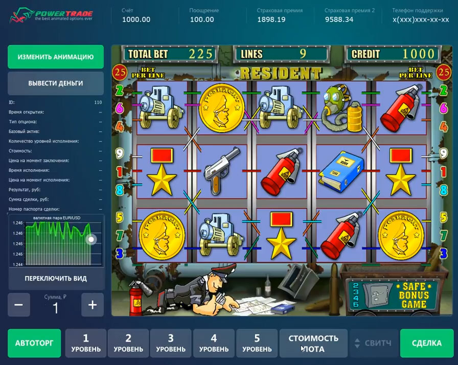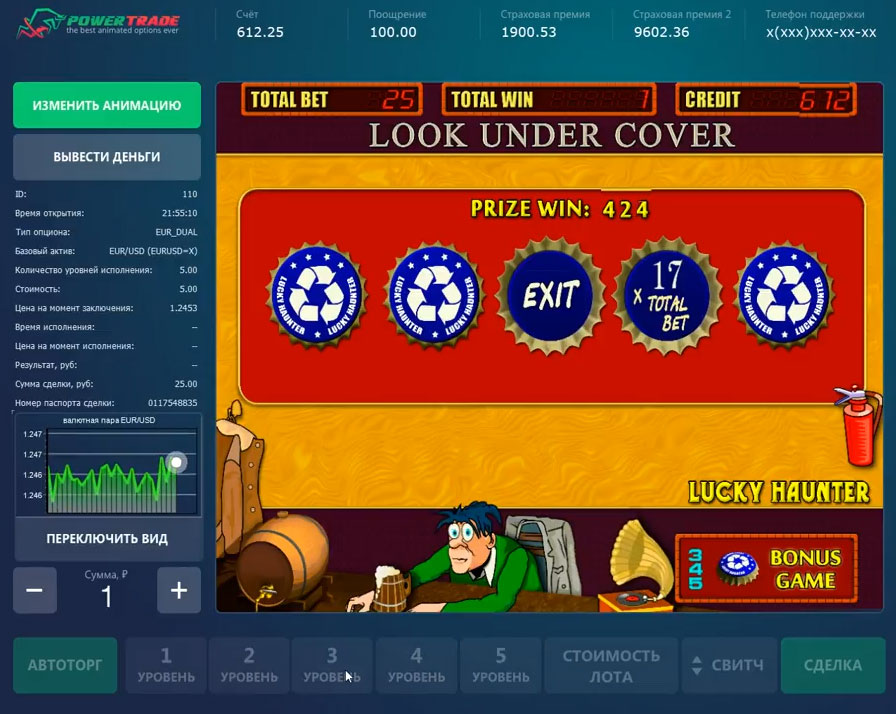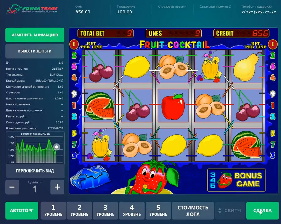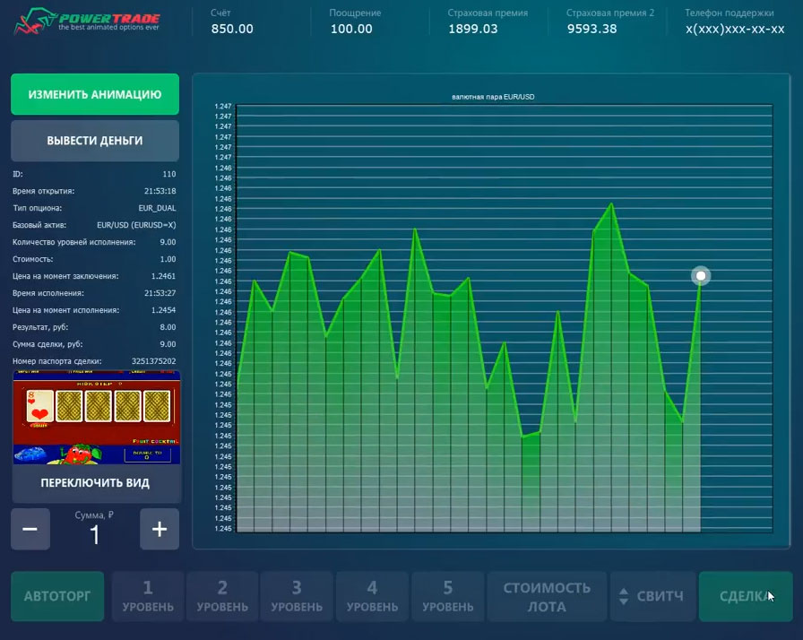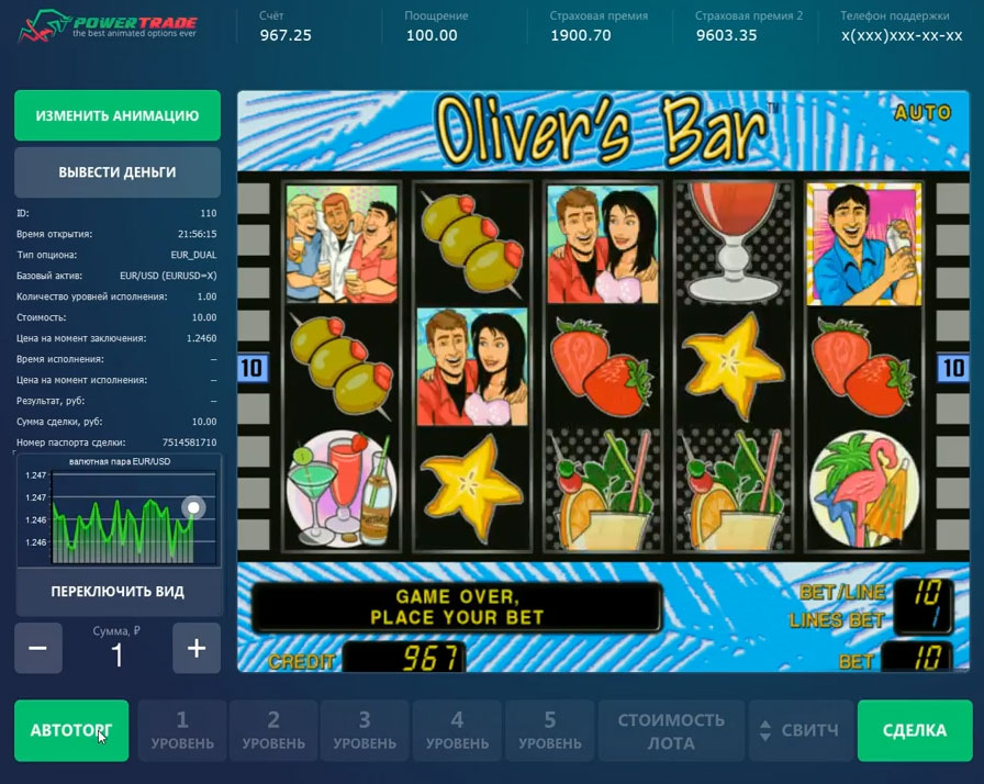 Сегодня мы с гордостью презентуем Вам торговую платформу PowerTrade. Повертрейд это программное обеспечение для лотерейных терминалов и игровых клубов, позволяющее клиенту заключить договор на короткое время (до трёх секунд). Таким договором, который принято называть опционом, определяются условия изменения цен на базовый актив в будущем. В зависимости от изменения цены игрок или получает прибыль, если правильно предсказал изменение цены, или нет, если ошибся в рассчетах. У трейдера есть возможность выбора параметров контракта, например, количество уровней исполнения, стоимость лота, деноминация и прочие параметры для работы. Визуализации исполнены в стиле классических и всеми любимых слотов Новоматик, Игрософт, Белатра и т. д.
