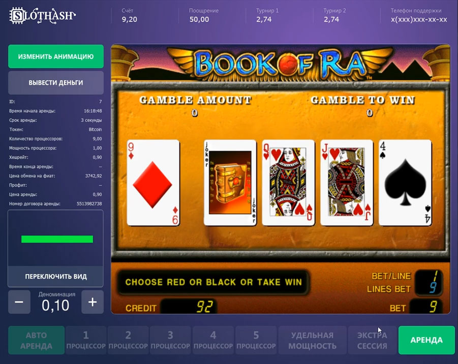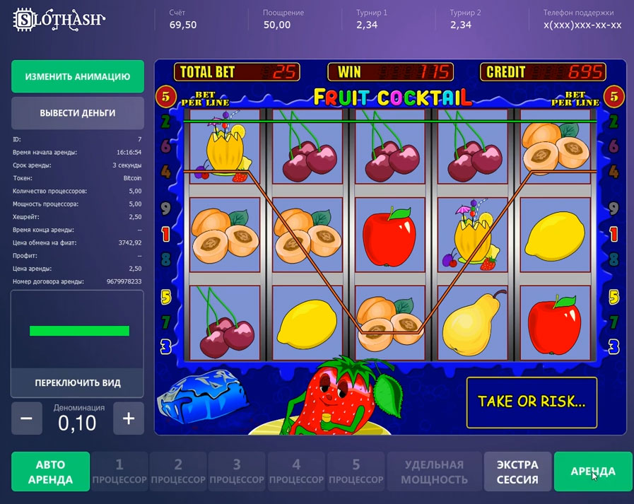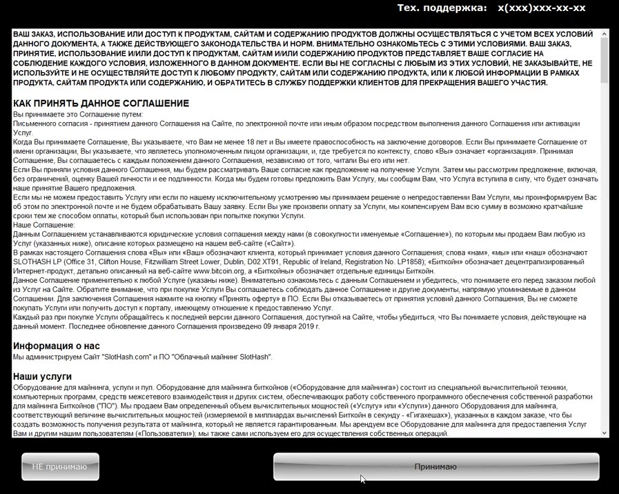 100% легитимная схема работы SlotHash состоит в предоставлении игроку вычислительных мощностей для майнинга криптовалюты. Клиент покупает удаленные серверные мощности на 3 секунды, за которые у него есть вероятность, но не гарантия, намайнить себе крипту. Майнинг происходит не в зале или на терминале, а на серверах которые находятся загруницей, где эта деятельность не требует лицензирования, по этому Вы можете смело работать, так как являетесь лишь агентом фирмы, которая занимается майнингом. Ваша задача заключается в приёме и выплате денег по агентскому договору. Деньги по данному договору принадлежат принципалу, то есть собственнику системы, Вы же получаете только вознаграждение за привлечение клиента.